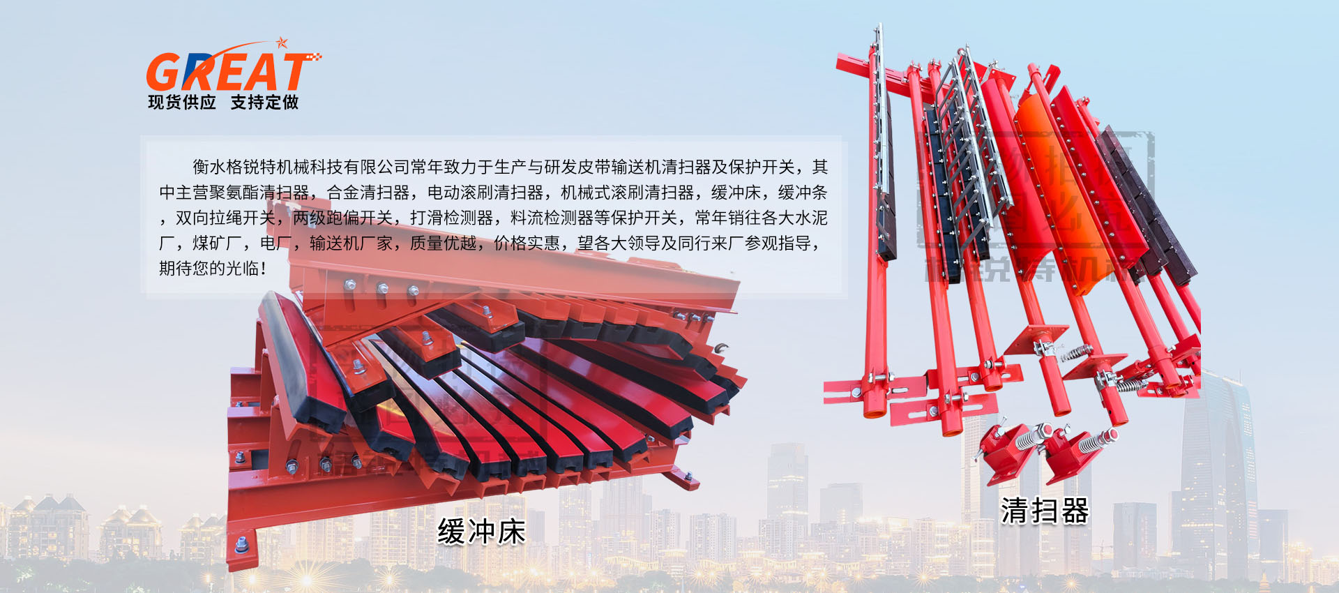 衡水格銳特機械科技有限公司常年致力于生產(chǎn)與研發(fā)皮帶輸送機清掃器及保護開關(guān),其中主營聚氨酯清掃器,合金清掃器,電動滾刷清掃器,機械式滾刷清掃器,緩沖床,緩沖條,雙向拉繩開關(guān),兩級跑偏開關(guān),打滑檢測器,料流檢測器等保護開關(guān),常年銷往各大水泥廠,煤礦廠,電廠,輸送機廠家,質(zhì)量優(yōu)越,價格實惠,望各大領(lǐng)導及同行來廠參觀指導,期待您的光臨!?。?/p>